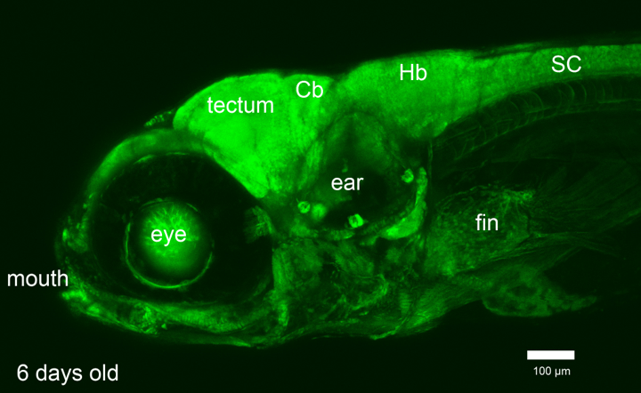 Abbildung: Bringen wir die Nervenzellen des Fischgehirns dazu, fluoreszierende Farbstoffe herzustellen, können wir am Leuchten der Neurone ablesen, wie aktiv sie gerade miteinander kommunizieren. (6 Tage alte Fischlarve der transgenen Linie Et(E1b:Gal4-VP16)s1101t, Tg(UAS:Kaede)s1999t; A. Arrenberg 2009, Dissertation)