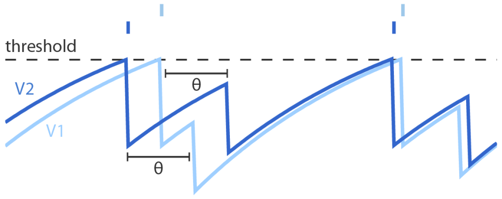 Abbildung: Erfahren miteinander verbundene Neurone erst nach einer Wartezeit θ von den Signalen des jeweils anderen, werden sie selbst unnötigerweise aktiv (hellblau), obwohl andere (dunkelblau) die anstehende Aufgabe bereits erfüllt haben. Dies führt zu unnötigen Aktionspotentialen und kann das ganze neuronale Netzwerk durch Kettenreaktionen destabilisieren. (Calaim, Dehmelt, Gonçalves, Machens 2022)