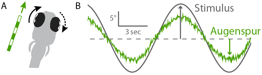 Abbildung: (A) Videos mit bewegten Balkenmustern regen Fische zu wiederholten Augenbewegungen an. (B) Diese Bewegungen erlauben uns, die Präzision der Informationsverarbeitung im Gehirn zu messen und so die Aktivität der Neurone zu interpretieren. (Dehmelt, Meier, Hinz et al. 2022)